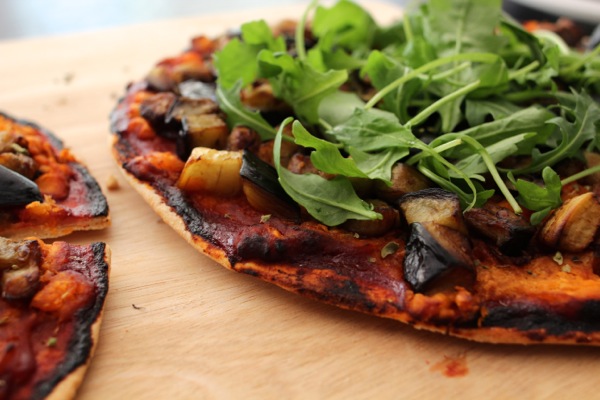 Cheese-free and yet oh so delicious, this vegan pizza is protein-rich with a creamy white bean paste base, topped with eggplant and oregano flakes.