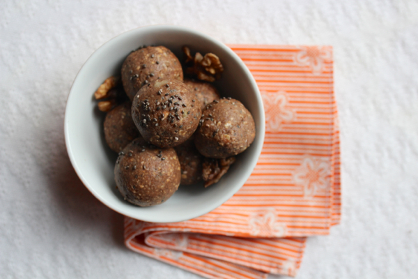 Raw vegan choc banana bliss balls packed with protein-rich walnuts and chia seeds and naturally sweetened with agave syrup and dates.
