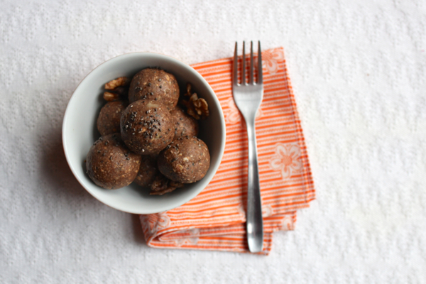 We tweaked the recipe a little, adding some walnuts and chia seeds to give our bliss balls a protein punch. We also threw in a little carob powder because we love it so much. And, of course, I used my brand spankin’ new food processor to whip these guys up.